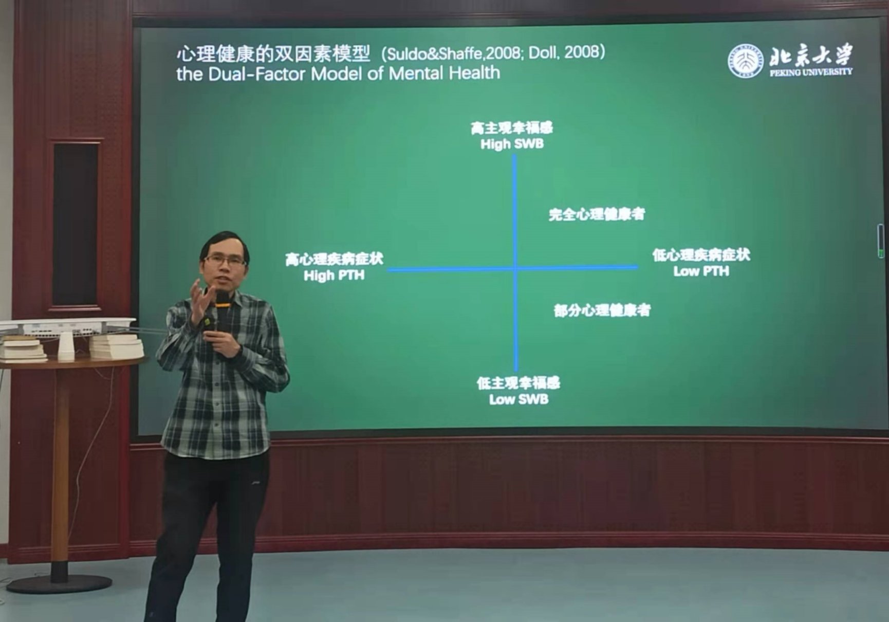 其次,庄明科就心理健康的双因素模型和积极心理学的幸福五元素PERMA理论(Positive emotion、Engagement、Relationship、Meaning、Accomplishment)展开介绍。他指出,生活是艰辛的、复杂的,漂亮的成绩单、资历不能与健康的心理、幸福的生活混为一谈。初始幸福感更高、做事越投入、拥有更加积极的关系、对生命的意义与价值感更高的人,更容易获得持续的幸福。