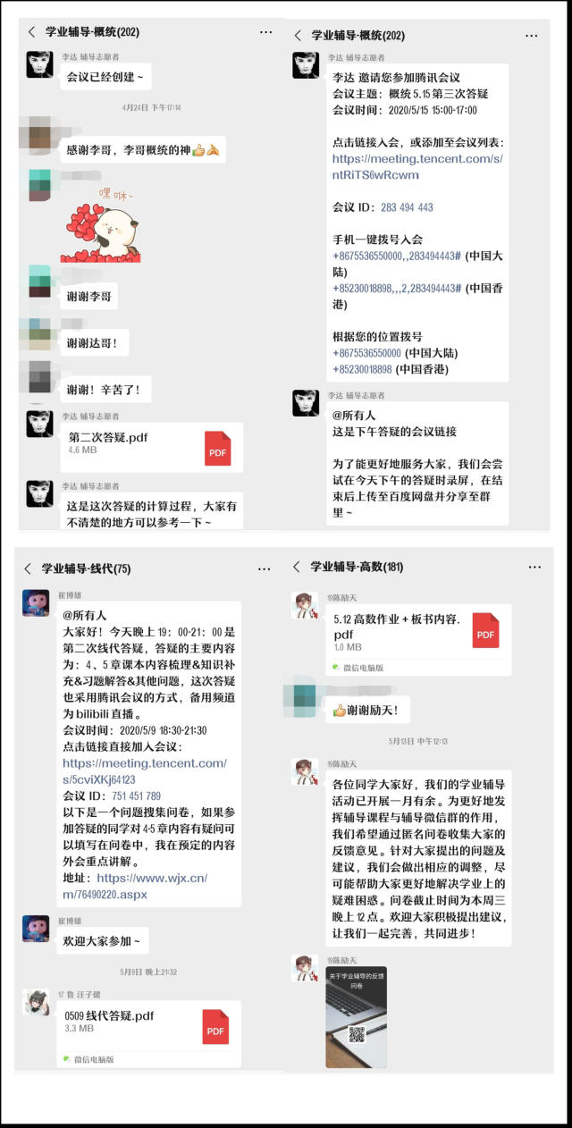 为更好解决同学们在大学数学必修课方面的疑难困惑,今年会分别建立了高等数学、线性代数、概率论与数理统计等三门学科的学业辅导微信群。微信群的主要功能在于分享学习资料、解决日常疑难、发布辅导通知与统计辅导需求。为更好地发挥其作用,由本学期选修对应课程的同学担任群管理员。管理员的主要工作为整理和发布课堂及习题课笔记,标注重难点,梳理习题解题思路,协助日常疑难解决,协助传达学院通知等。在为期半个月的试运行后,多名同学表示辅导群的建立对其解决学业困惑、整理笔记思路大有裨益。