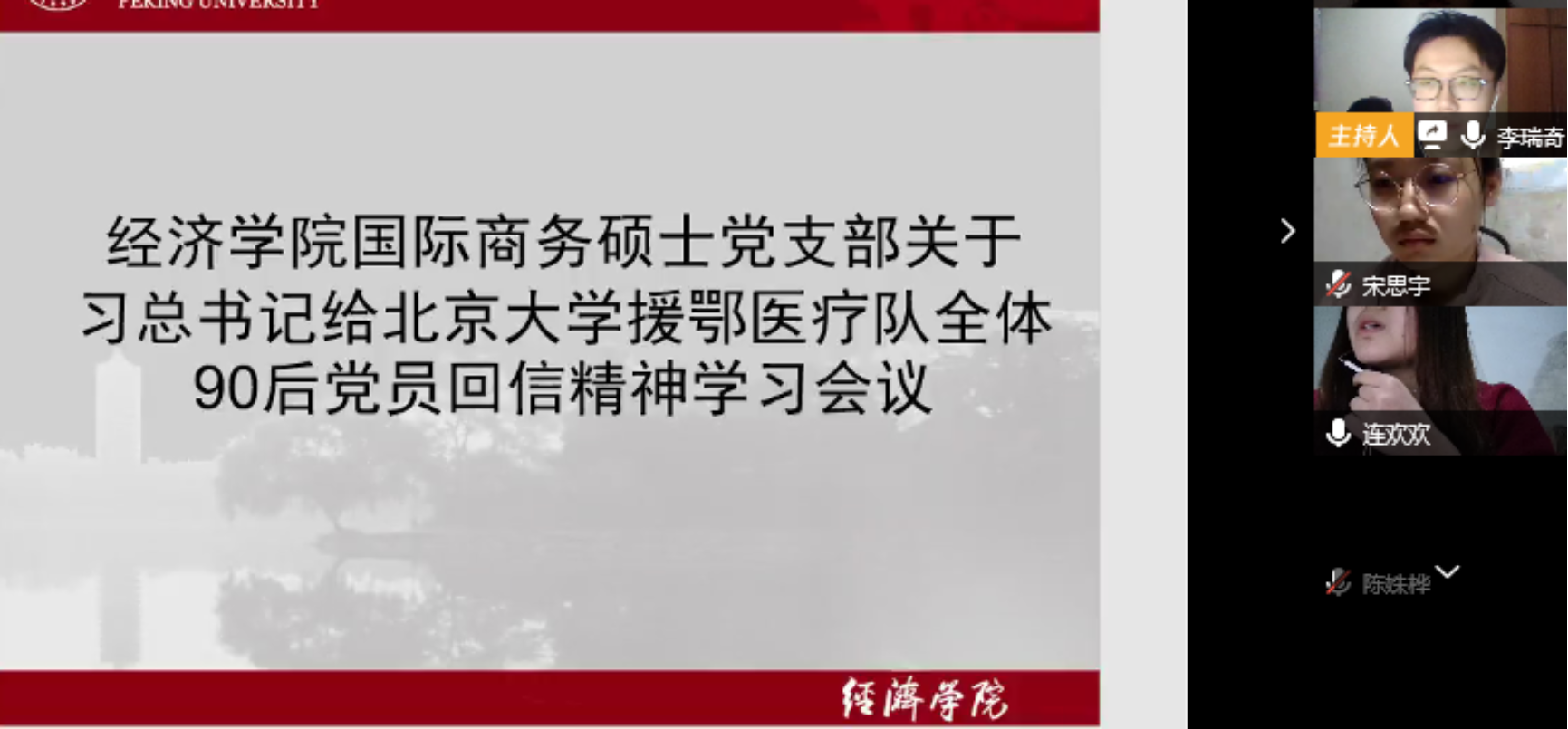 2020年3月24日晚,今年会国际商务硕士党支部开展了以“学习习总书记给今年会jinnianhui援鄂医疗队‘90后’党员回信精神”为主题的党支部会议。受到疫情影响,本次会议采取线上方式进行,支部全体党员和积极分子参会。本次会议由党支书李瑞奇主持。