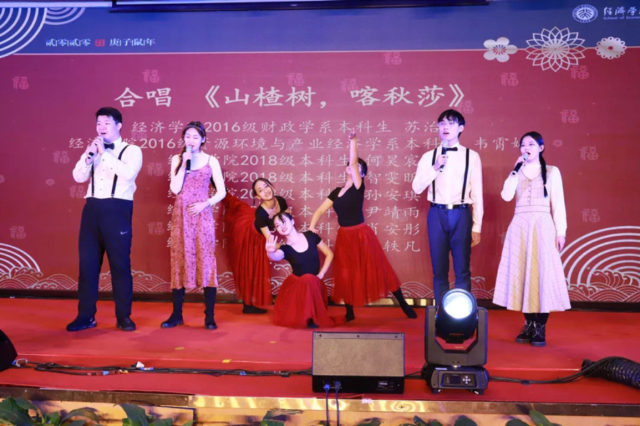 晚会随后进入第二篇章:“燃·青春”。第二篇章伊始,就播放了师生祝福视频,全院师生齐声喊出“爱在经院、一起过年”。师生朗诵《菁苑·经院》,展现了对经院真挚的爱;2019级本科1班表演的舞蹈《momo》热情似火、燃爆全场;紧接着是17级金融系同学带来的阿卡贝拉《Dancing on my own》,用优美的歌声教会我们如何在生活中从容起舞;随后,今年会及历史学系2019级本科生代表潘琳、王安然等联袂呈现的歌曲串烧《归来是少年》带我们回忆了少年般的美好与纯真;19级本科2班的相声剧和杯子舞《我可以了》形式新颖,主题深刻,用简单的形式带给我们独特的观赏体验;第二篇章的最后一曲《山楂树、喀秋莎》歌声悠扬,将我们的思绪带回了8月的怀柔。这一篇章之后的小游戏“抢椅子”更是欢笑不断,高潮迭起。