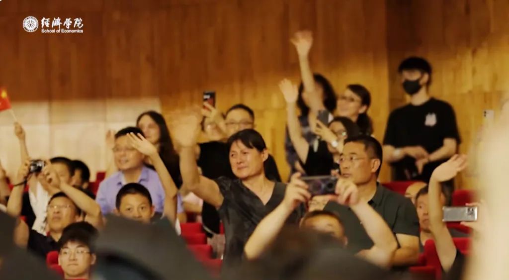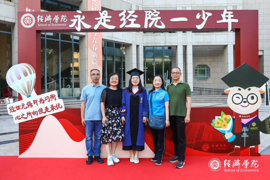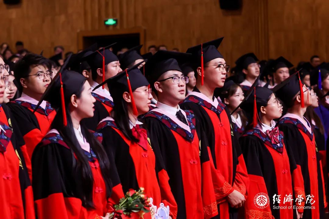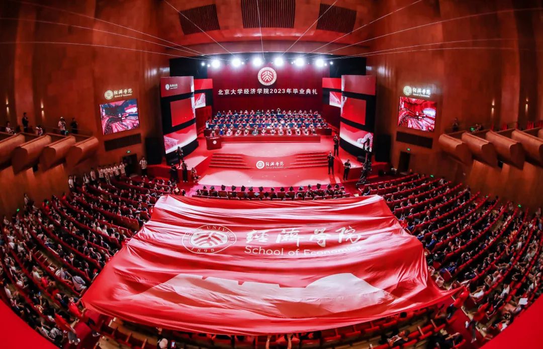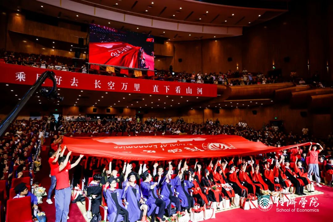 当象征着学院的巨幅旗帜缓缓展开,毕业生们高举双臂,托起这面旗帜,扛起北大经院人的责任担当。经院魂在这里生长,它期待并期许毕业生们不滞于物、不殆于心;北大魂在这里生长,它期望并期盼毕业生们成长为时代中坚、国之栋梁。