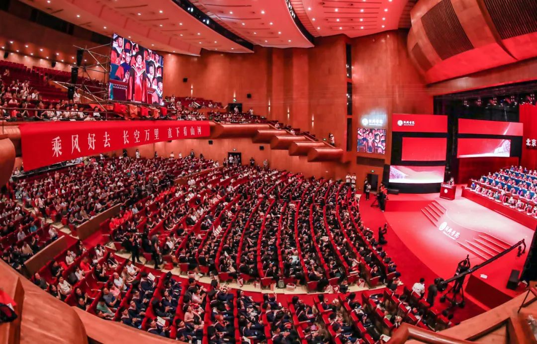 “携手千山万水,行至盛夏灿烂”,典礼如约而至。鼓钟将将,钟音朗朗;三声钟鸣,震彻心扉。“乘风好去,长空万里,直下看山河”,戏腔唱响,响彻大厅;京剧联排,惊艳全场。深藏在血脉中的文化基因,在花枪的舞动中觉醒,在字正腔圆的演唱中传承。北大2023届硕士毕业生江宇梁带来《梨花颂》,委婉大气,回味悠长。