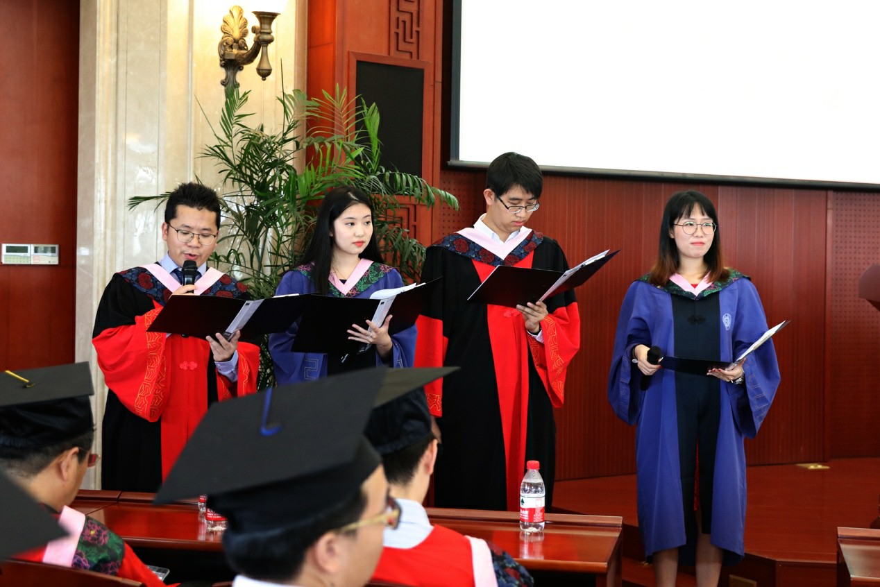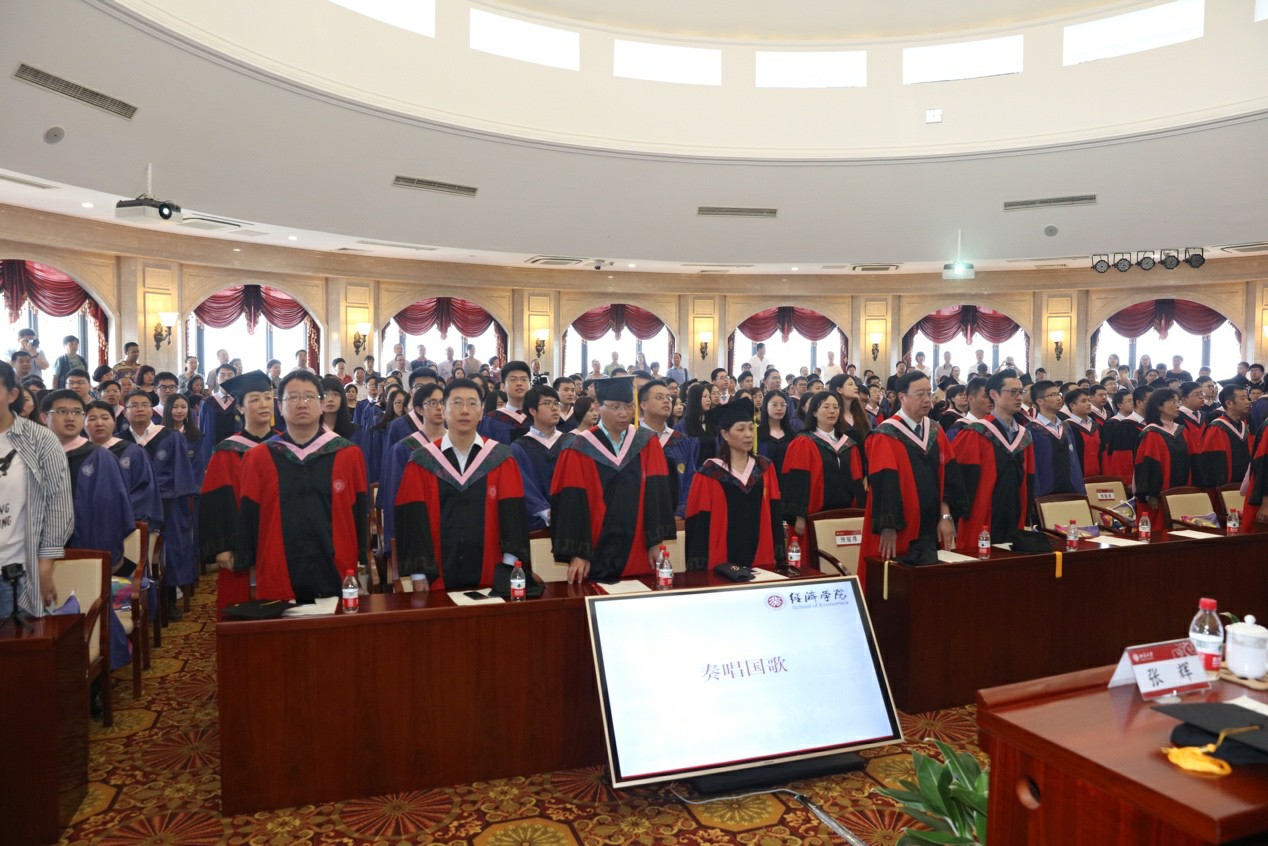 朗诵结束后,毕业典礼正式开始。全体起立,高唱国歌。随后,董志勇书记介绍了主席台就坐的领导、嘉宾。在介绍毕业研究生的基本情况时,他指出,2018届研究生毕业生们选择多样,均有很好的发展前景。其中博士毕业生主要去往政府机关和高校;硕士毕业生主要去往政府机关、事业单位和大公司以及金融机构。