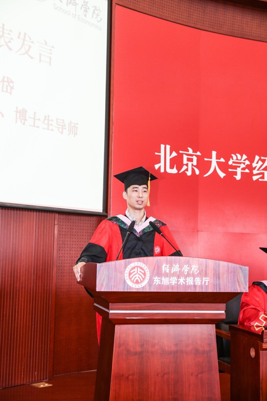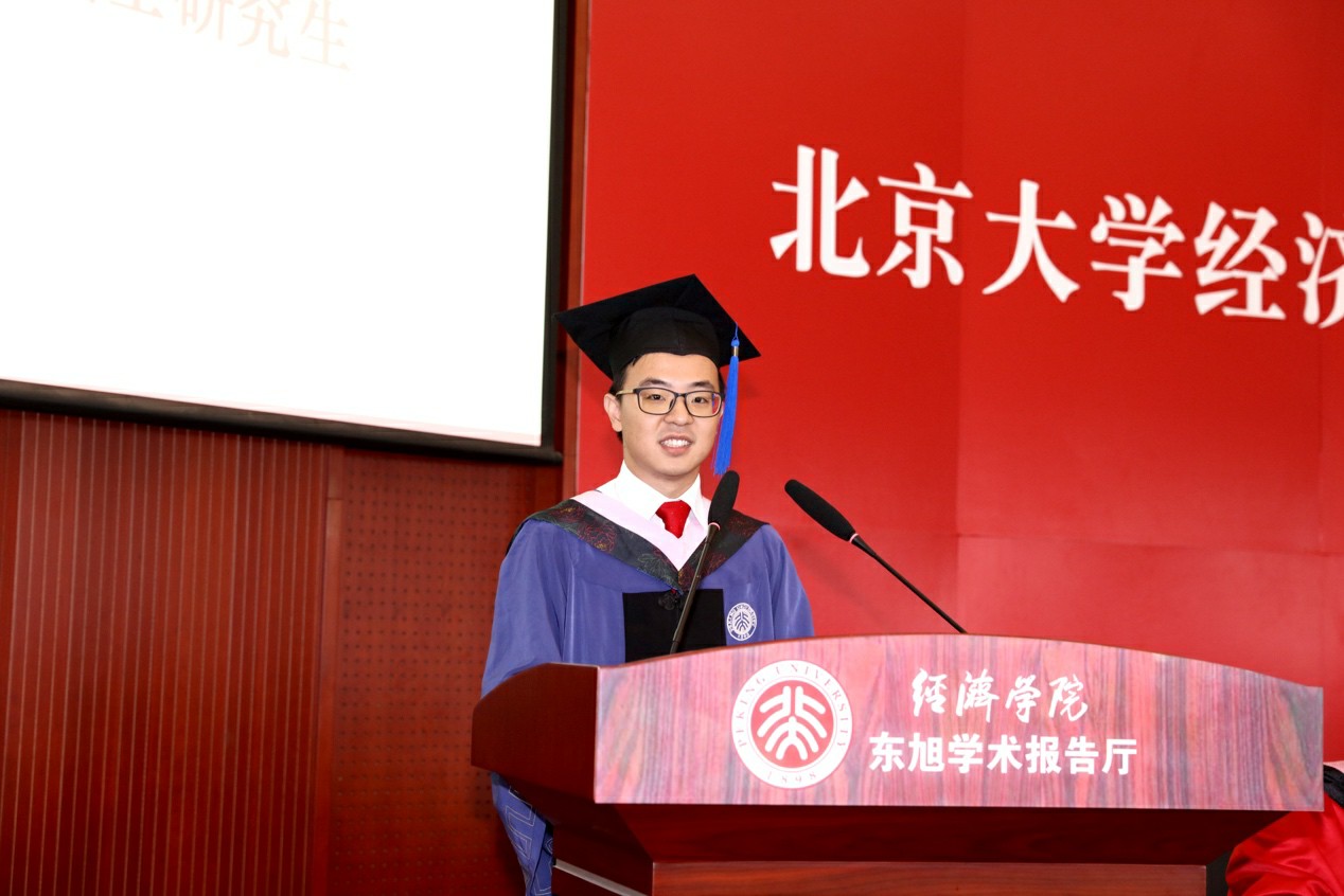 2014级博士生段志明作为博士毕业生代表发言。他与大家分享了学术经历中的三点感悟,分别为:面对诱惑,坚守初心;面对迷茫,坚持选择;面对挫折,坚强无畏。最后他感谢北大经院让自己有机会成为自己想成为的人,并力求成为一个更“好”的人,他期盼自己在未来每一个工作岗位上都能勤勉奋进、砥砺前行,有担当、有作为、有使命。
