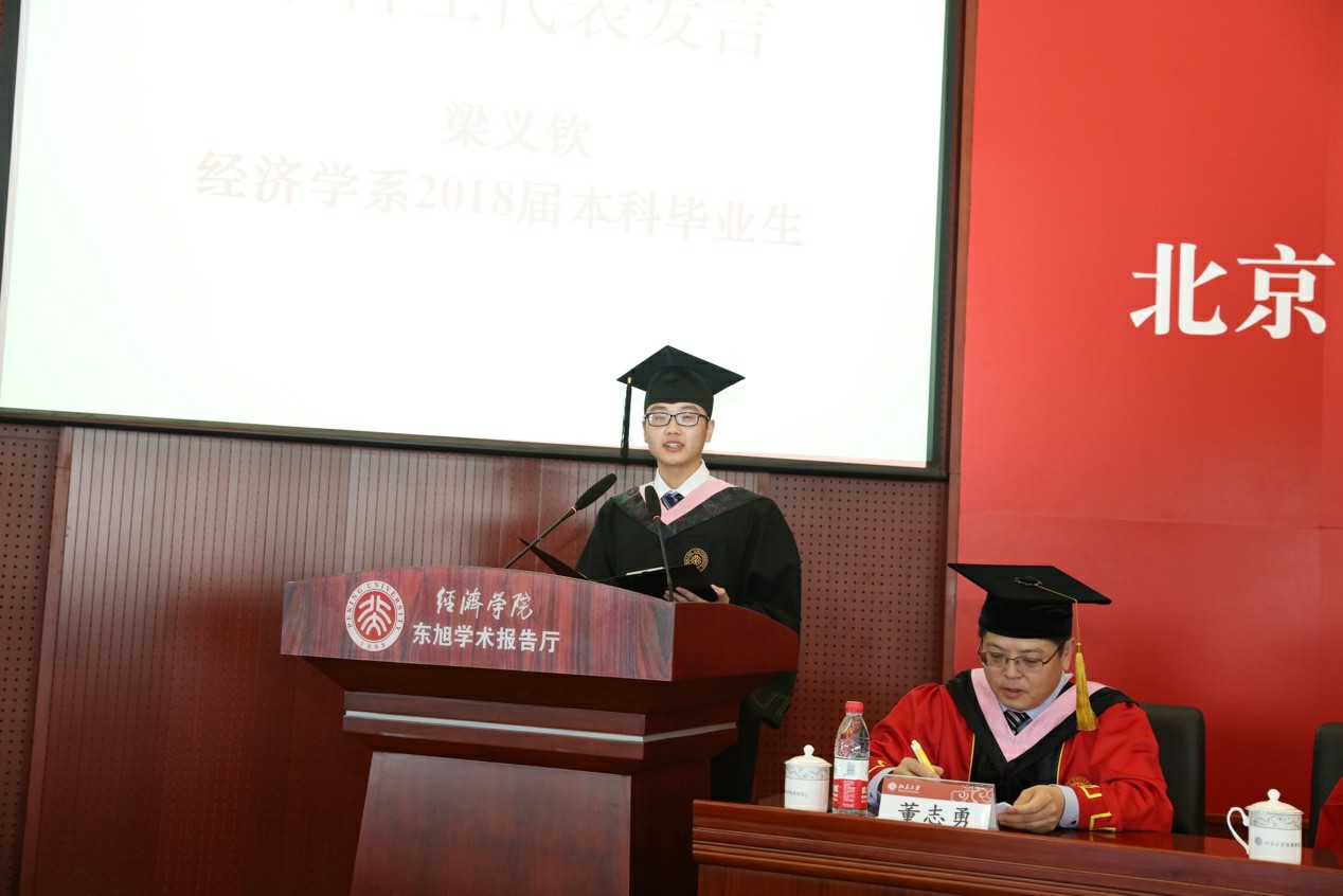2014级本科生梁义钦则在回顾自己四年来的变化时,着重提到了老师、同学的交流互动中,所塑造的人格、思想和学养对他的影响。他从身边各自闪烁着不同闪光点的同学谈起,指出北大经院教给了同学们如何做一个不平凡的“普通人”,并祝愿大家都能成为更优秀的自己。