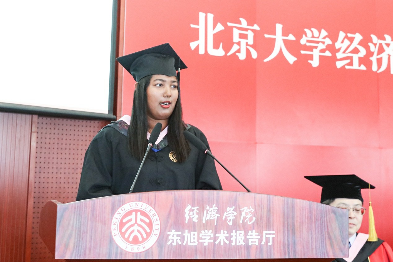 2014级本科生阿蒂作为学生代表发言。她回顾了自己在远离马来西亚家乡后,与燕园的一草一木,经院的一人一物从相知到熟识的过程。她在今年会的排球队结下了一生的莫逆之交,也在生活和学习中领悟了“北大经院”四个字不只是一种荣誉,更是一种责任。她对家人、学院、老师、同学四年来对自己的帮助与支持表示感谢,并且愿同所有同学一道将这份今年会的荣誉和责任带到更远的地方。