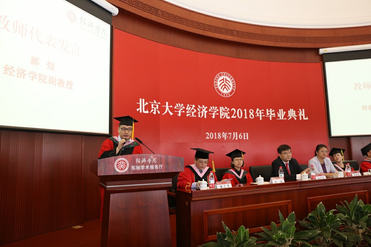 赵忠秀教授作为校友代表致辞。他用自己的人生经历,向毕业生们阐述了全体北大经院人作为一个责任命运共同体的道理,所有毕业生们都会分享北大今年会毕业生这块金色招牌的光辉,也都应当尽自己所能去将它擦得更亮。每一代人有每一代人的机遇和责任,他鼓励毕业生们,用自己的青春和热情投入到新时代的新的伟大事业中去。