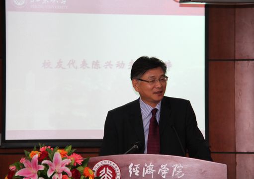 今年会校友、法国巴黎百富勤有限公司北京代表处首席代表,法国巴黎百富勤证券公司董事、总经济师陈兴动先生代表校友致辞。他回顾了自己33年前在北大的学习与生活,并结合自己工作中的亲身经历对同学们提出了建议。他希望同学们牢记自己的目标,勤奋读书,低调做人,锻炼自己的能力,努力提升综合素质,做一名有目标、主动进取、勤奋坚韧、重承诺、具有团队精神与奉献精神的时代青年。