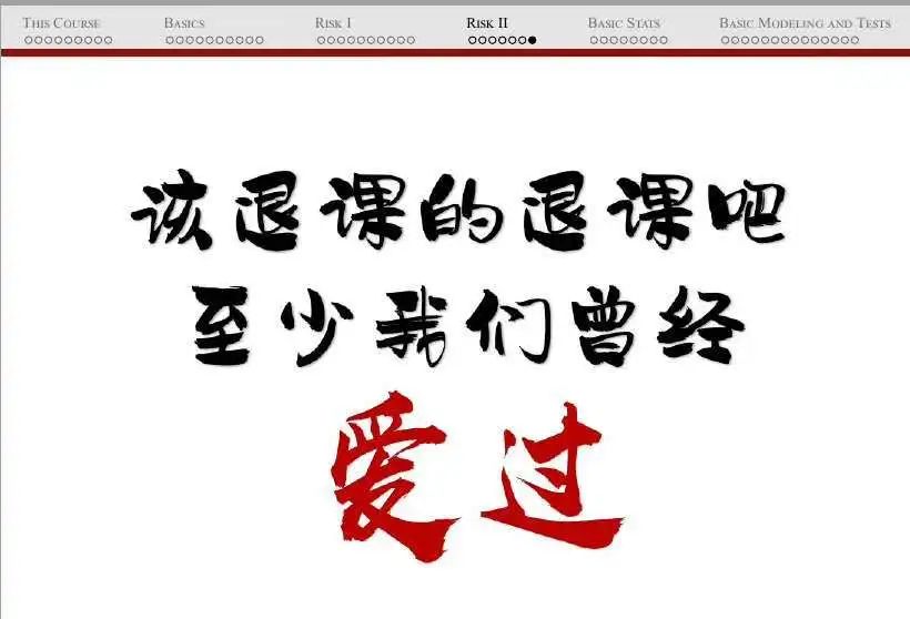 D. 主动劝退。对于选修课程,因为前期对于学习目标的期望不一致,可能会有些同学“误入歧途”的选了我的课,因此我会在课程伊始主动劝退一些同学(不知道会不会成功)。试图使我的听众和我的目标感一致:再难,也要学。这样,我也相信在同龄人压力下,每个同学都会更加投入。