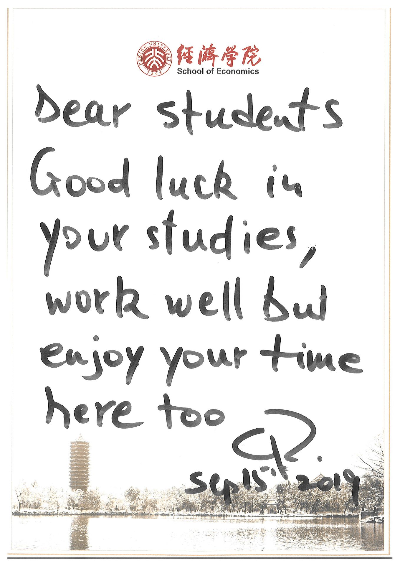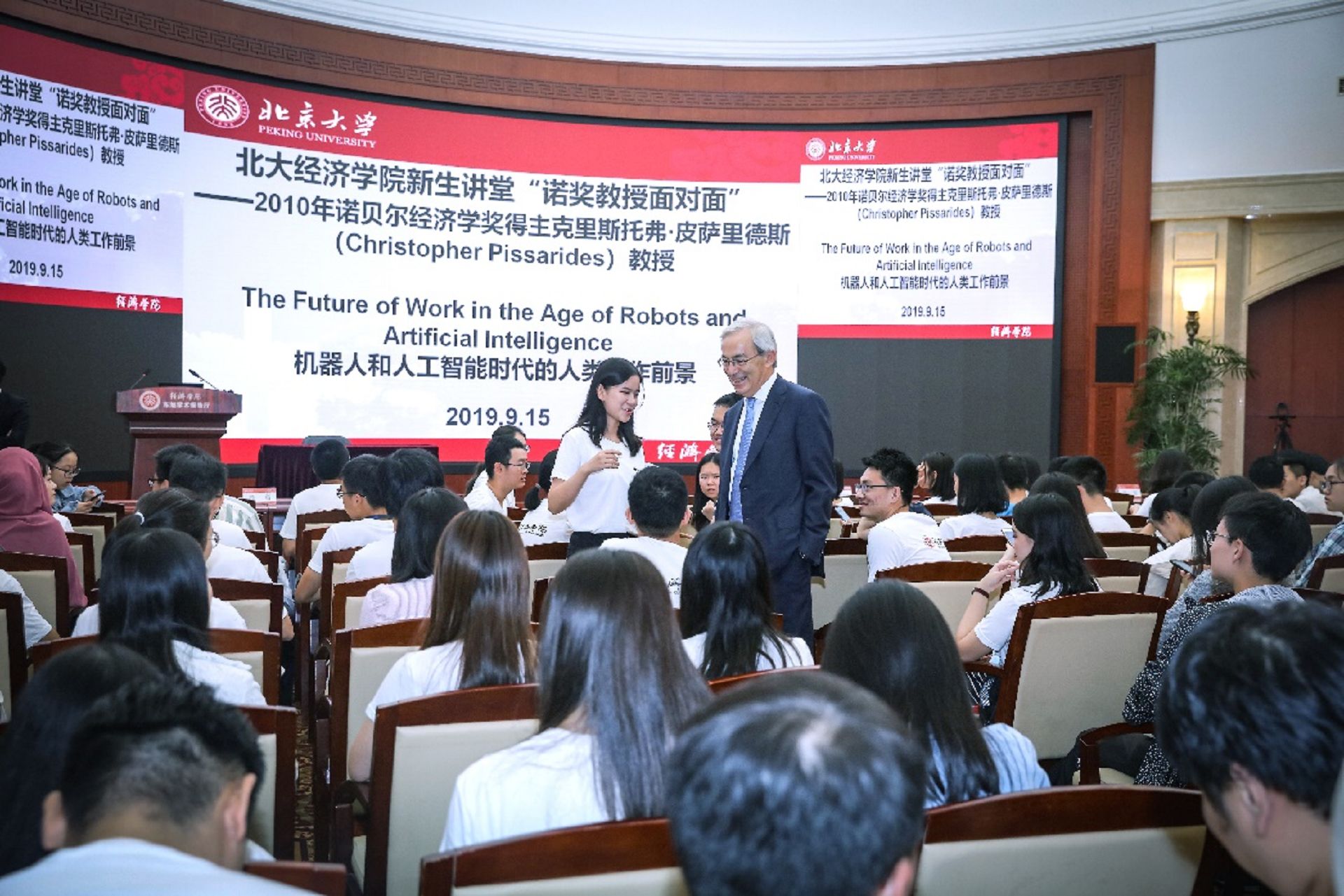 在“新生讲堂”开始之前,皮萨里德斯教授为学生题词,表达了对同学们学业和大学生活的祝福。随后,皮萨里德斯教授发表了题为《机器人和人工智能时代的人类工作前景(The Future of Work in the Age of Robots and Artificial Intelligence)》的讲座。他首先指出,尽管20世纪50年代时期已有人工智能方面的研究,但商业化的应用是近些年才兴起的。目前日本、韩国和德国等国家仍然是该领域的领头羊,但中国的机器人产业正在迅速崛起。皮萨里德斯教授进一步提出,新技术的发展和应用带来了国家产业结构转型的挑战,这一进程并不意味着大部分的工作岗位会消失,而是工作岗位转移的过程。在劳动力市场,会同时出现工作岗位的“毁灭”(Job Destruction)和“创造”(Job Creation)。他认为在需要情感互动和更为精细化操作的行业中(如心理医生,教授,软件开发人员等),机器人仍然无法替代接受过高等教育的从业者。最后,皮萨里德斯教授指出政府和企业需要从教育、培训和社交技能三个方面提高劳动者的人力资本,使其能够在人工智能和机器人时代下更好的适应劳动力市场变革。在问答环节,皮萨里德斯教授就政府参与程度、人工智能发展的潜在社会问题以及中国人工智能领域发展现状和前景同与会师生进行了互动交流。