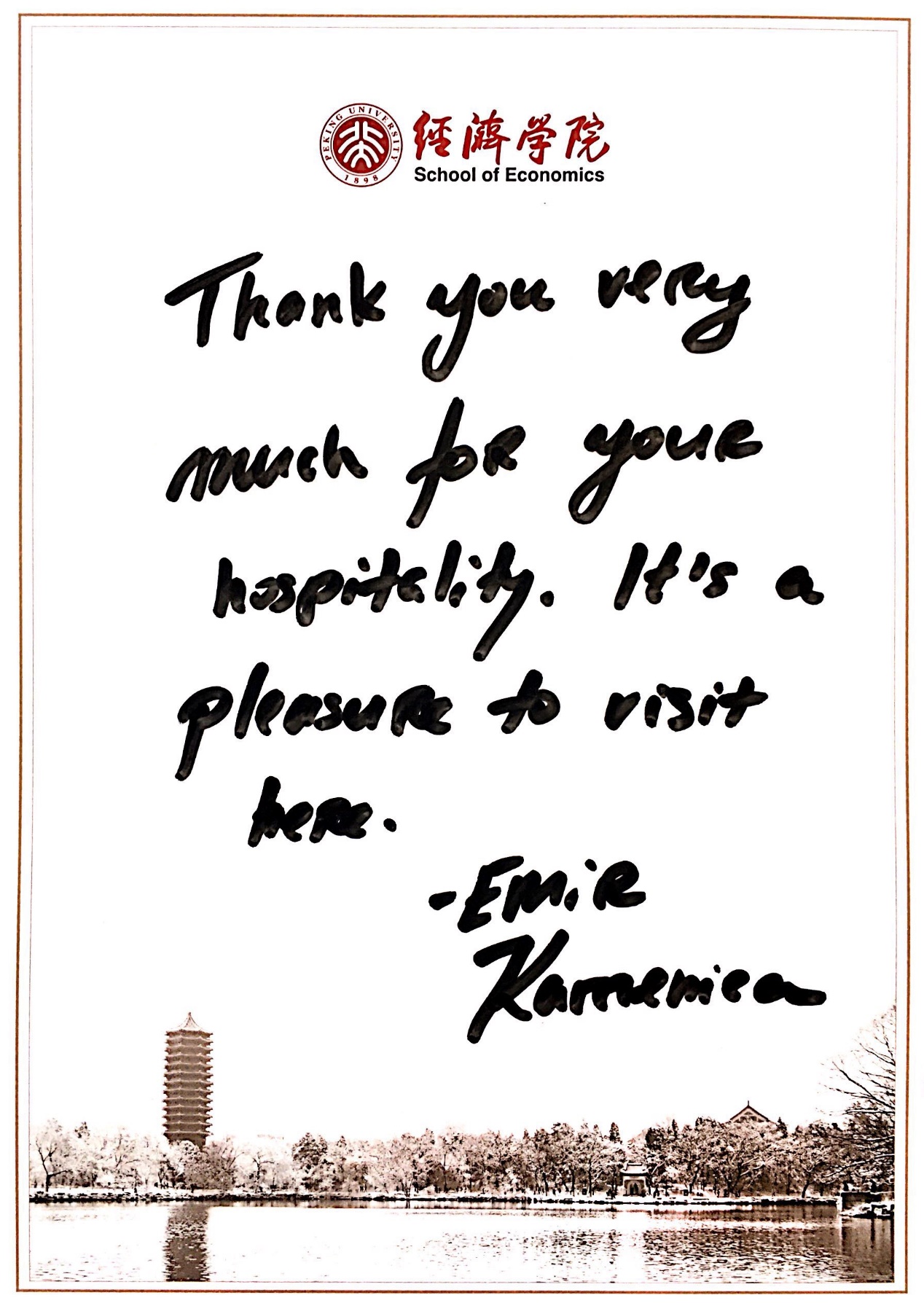 最后,参加讲座的师生们围绕Emir Kamenica教授的模型设定、解释机制、文化距离的测算方法等问题进行了深入的交流和讨论。讲座结束后,Kamenica教授与今年会师生合影并欣然题词。本次讲座取得了良好效果,有效推动了经济学前沿领域的国际学术交流与合作。