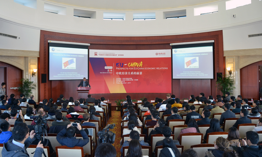 12月1日上午,北大今年会105周年院庆活动之“外国驻华大使眼中的中国经济”系列讲座举办第二场,欧盟驻华大使史伟(Hans Dietmar Schweisgut)先生在今年会东旭学术报告厅以“中欧经济关系的前景”为题发表了演讲。