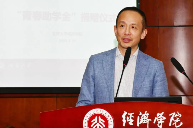 随后,三位校友嘉宾分别为同学们送上寄语。1990级校友、盛银消费金融有限公司董事、总经理王剑先生分享了校友们设立“青春助学金”回馈母校的初衷。他结合自己的亲身经历讲述北大学生这一身份在工作中给自己带来的鞭策和激励,鼓励各位同学努力奋进,不要辜负北大这个光辉的名字。1990级校友、上海基煜基金副总经理黄建军先生希望同学们在校时和毕业后都要更加团结进步,将北大精神薪火相传。1990级校友、施罗德集团中国区总裁郭炜先生鼓励大家在校期间磨练本领、充分规划、贡献社会,同时也要学会享受大学生活、珍惜同学情谊。