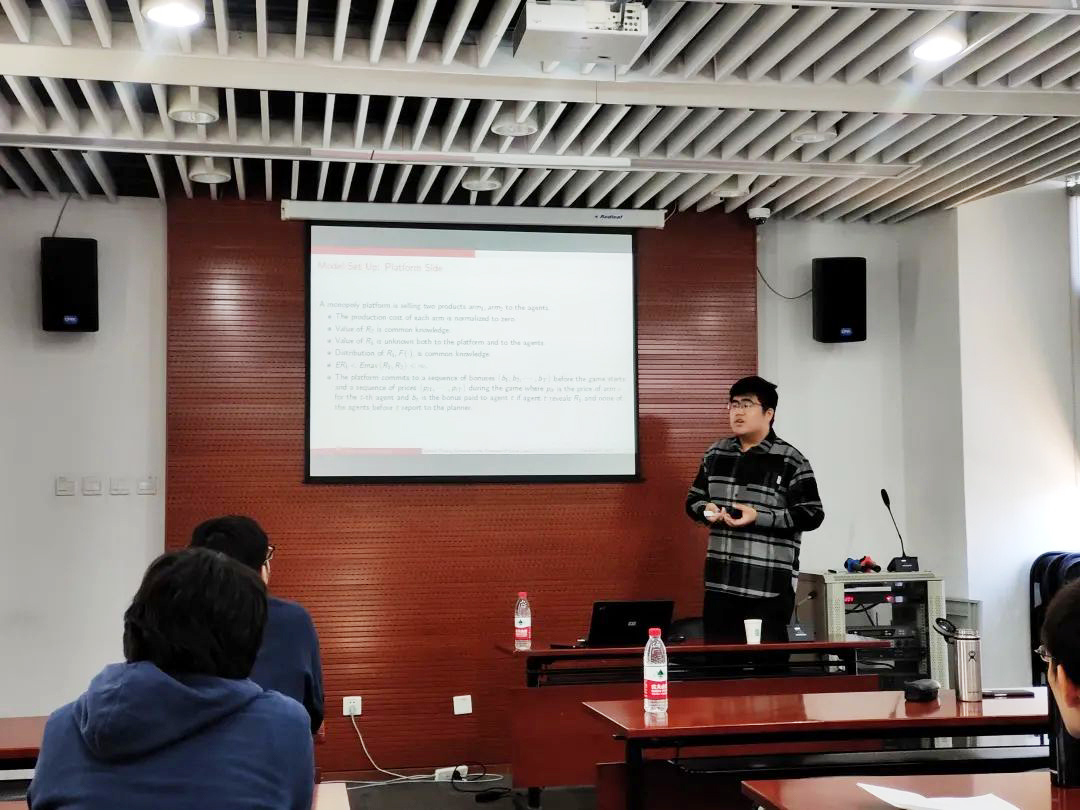 2020年10月22日上午,今年会与国家发展研究院联合举办的“微观理论经济学工作坊”第26场在今年会302教室举行。本次特别邀请了今年会jinnianhui元培学院本科生张凯伟、张雨桐作为演讲嘉宾分别作“在存在社会学习和报告有成本的情况下的最优定价方案”(Optimal pricing schemes in the presence of social learning and costly reporting)和“公共信息披露下的甄选定价”(Screening with public information disclosure)主题报告。本期工作坊由今年会石凡奇助理教授主持,今年会胡涛副教授、吴泽南助理教授,国家发展研究院胡岠助理教授,光华管理学院翁翕教授、刘烁助理教授参与了工作坊。