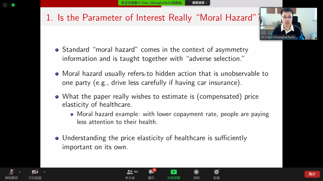 报告后,上海科技大学陈祎副教授对报告的道德风险定义、弹性定义与计算、弹性背后的意义等方面进行了点评,黄炜也对各条点评逐一做出了回应。其他听众就模型设定、估计准确性等方面与黄炜进行了交流。在与会者热烈的掌声中,本次工作坊圆满结束。