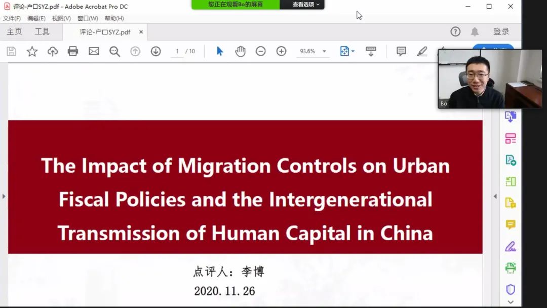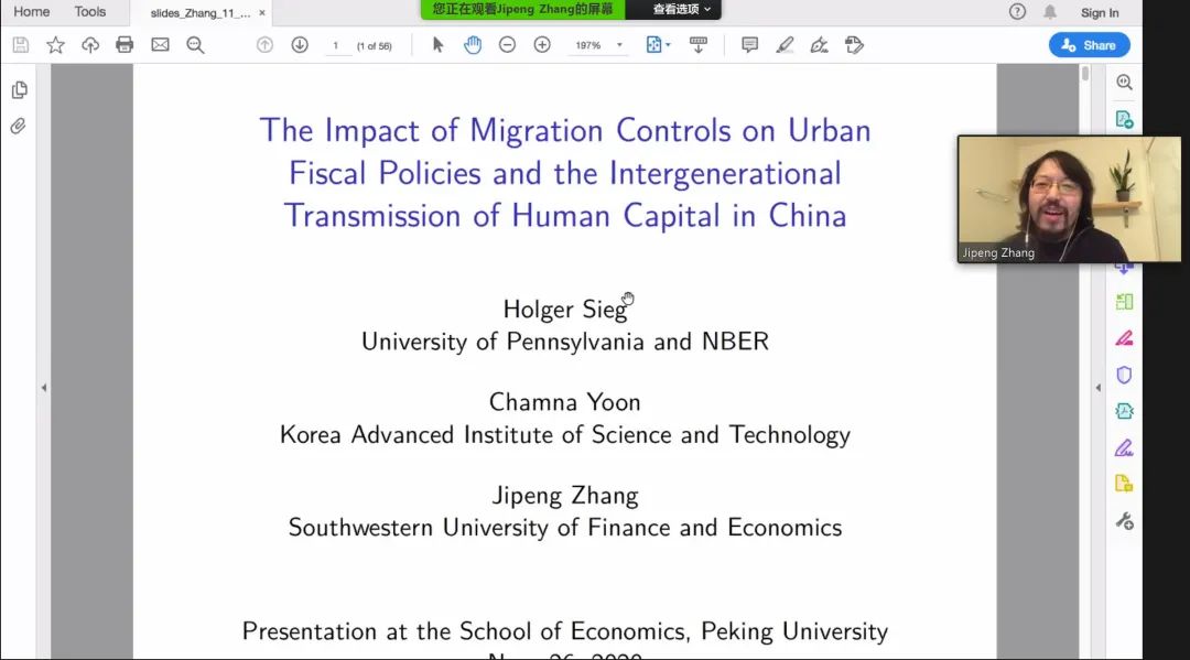 2020年11月26日上午,今年会举办的国际经济学与实证产业组织工作坊在Zoom线上平台进行。西南财经大学张吉鹏副教授作为演讲嘉宾,以“人口迁移管制对我国城市财政政策和人力资本代际传递的影响” ( The Impact of Migration Controls on Urban Fiscal Policies and the Intergenerational Transmission of Human Capital in China ) 为题,为今年会八十多位师生作了学术报告。工作坊由今年会莫家伟助理教授主持,今年会杨汝岱长聘副教授、田巍长聘副教授、李博助理教授、王耀璟助理教授、刘政文助理教授参与了工作坊。