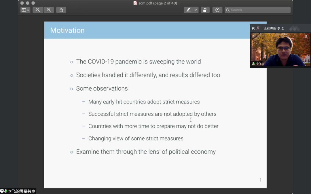 李飞副教授的报告研究了一个社会对共同危机的顺序反应模型。一个政府面临着一个“两败俱伤”的决策困境:积极干预遏制了危机,但由此产生的良好结果使公众对代价高昂的应对措施产生怀疑;轻干预加剧了危机,也导致政府出现失误。这样的困境增加了政府采取有效政策的政治成本。如果有另一个社会随后面临同样的危机,这种政治障碍可以得到缓解。研究表明,尽管拥有更多的信息,但晚些遭遇危机的国家并不一定表现得更好,而遭受更早打击的国家可能会从信息溢出效应中获益。