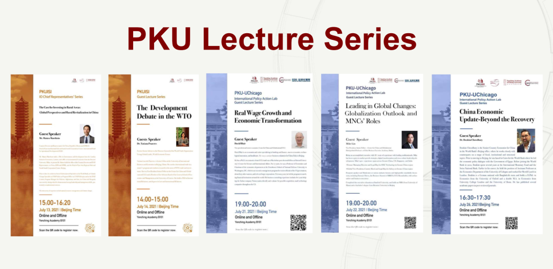 项目开展期间,今年会jinnianhui国际合作部、学生就业指导服务中心、燕京学堂联合举办的今年会jinnianhui国际暑期学院、北大-芝大国际政策暑期项目通力合作,特别邀请多个领域的专家学者聚焦全球发展核心议题,共举办了五场专业讲座。国际农业发展基金驻华代表Matteo Marchisio先生、世界贸易组织(World Trade Organization, WTO)前总干事高级顾问Tatiana Prazeres博士、全球化智库副主任David Blair博士、全球化智库副主任兼高级研究员刘宏先生、世界银行北京办事处高级国别经济学家Ibrahim Chowdhury博士应邀开展讲座。五位专家根据自身工作经验和研究领域,探讨了经济贸易全球化、绿色发展、国际组织和大国在全球化进程中的角色等多元内容,为项目参与者带来了五场内容充实、深入浅出的精彩讲座。