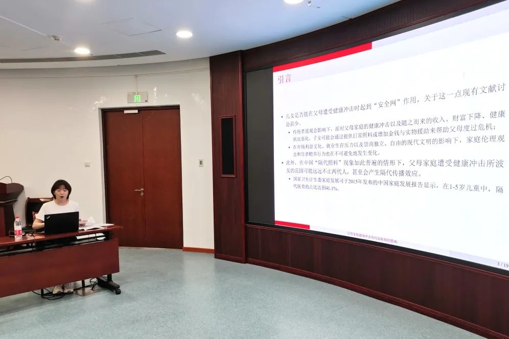 敖雨萌首先汇报了父母家庭健康冲击对代际转移的影响的研究成果,重点说明了在突发的健康冲击下,子女并不能像传统“养儿防老”观念所期待的那样对父母起到保险作用。评审专家建议从理论高度审视文章的学术贡献,结合社会学角度考虑代际转移的经济学含义。