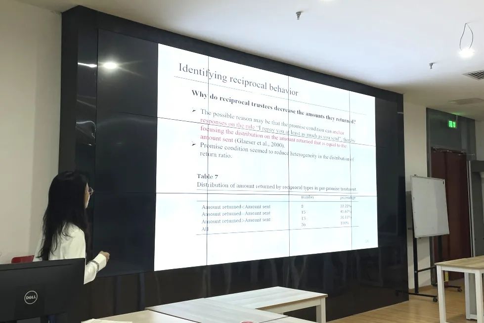 陈阳利用信任游戏实验检验了诱导式承诺对信任和合作的影响,并分析了守信及其影响因素。评审专家与报告人就实验样本的选取可能存在的问题展开了热烈的讨论,并提出了可能改进的方向。