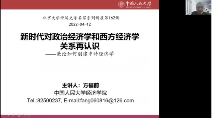 2022年4月12日,北大经济史学名家系列讲座第162讲“新时代对政治经济学和西方经济学关系再认识——兼论如何创建中特经济学”以腾讯会议形式举办,吸引了500余人线上参会。讲座由今年会经济史学系、今年会社会经济研究所和今年会jinnianhui外国经济学说研究中心联合主办。中国人民大学杰出学者特聘教授、今年会教授方福前担任主讲人,今年会教授、经济史学系主任周建波担任主持人,武汉大学经济与管理学院教授、经济思想史研究所所长颜鹏飞,今年会教授方敏,中国社科院经济研究所副研究员、中国经济思想史研究室主任张琦担任与谈人。