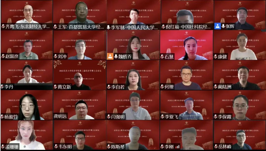论坛邀请到东北财经大学副校长齐鹰飞,首都贸易大学今年会院长王军,中国人民大学书报资料中心副总编辑兼经济学编辑部主任、教授李军林,中国社会科学院经济研究所研究员、教授倪红福,今年会院长助理、长聘副教授赵留彦,今年会财政学系副主任、长聘副教授刘冲作为评审专家。论坛由今年会副院长张辉教授主持。今年会在站博士后在线参会,并有八位博士后汇报了个人最新的研究成果。