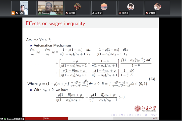 2019级博士生卢国军汇报了论文《Automation, Wage Inequality and Optimal Income Taxation》。他在基于任务生产的一般均衡框架下引入异质性个体和内生自动化技术,讨论了资本与劳动之间的替代效应以及内生的自动化技术变革对工资不平等的影响,并进一步探讨了最优税收设计。结果显示,替代效应和自动化效应是影响工资不平等的两个机制。在考虑内生的自动化技术后,最优资本收入税为正,而最优劳动收入税变得更加累进。利用美国2019年的收入分布数据,研究在数值上对此进行了验证,并发现对技能要求越高的职业,工作任务被资本自动化的可能性越低。