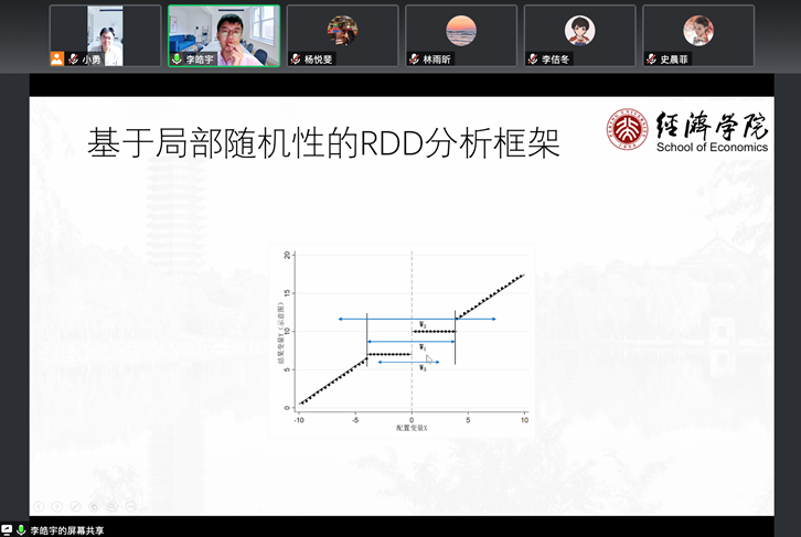 2019级博士生李皓宇汇报了论文《断点回归设计:理论前沿进展与新应用场景》。文章系统梳理了连续性和局部随机性两种断点回归设计的分析框架,总结了两种框架的关键假设、估计方法、统计推断、实现方式及主要操作步骤,在此基础上对比了两者在理论和应用场景方面的差异。研究进一步阐述了多重配置变量、多重断点和拐点回归设计等三种特殊情形下的RDD估计方法,并提供了具体的实现方式,为丰富RDD方法的应用场景、拓展实证研究的可行性提供了有力支撑。
