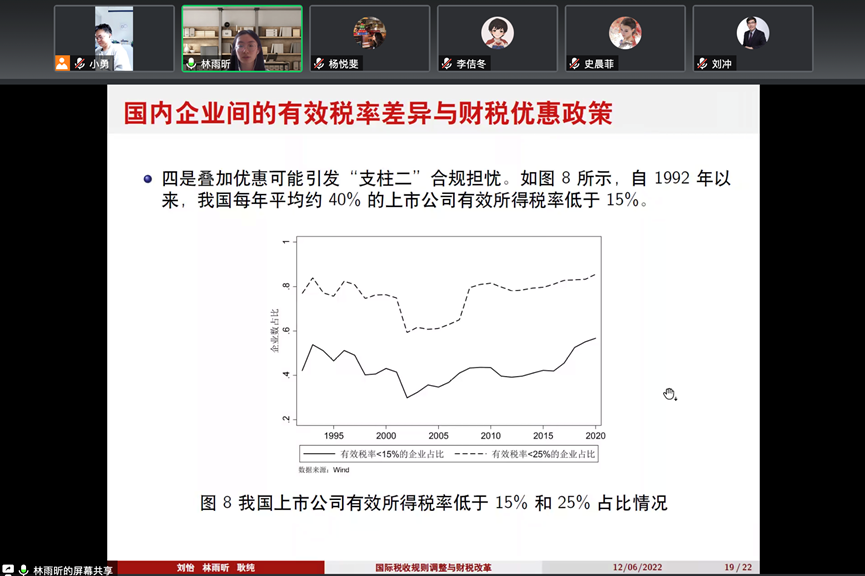 2019级博士生林雨昕汇报了论文《国际税收规则调整与财税改革》。她借鉴其中蕴含的关于征税权划分、税收竞争秩序规范的思想,综合使用上市公司数据及各国分税类税收收入数据分析发现,以货物和劳务税为主体的税制结构以及财税激励叠加是我国企业所得税有效税率偏低的主要原因。形式多样的税收优惠和财政补贴也导致地方财政压力增加、区域差距扩大、财政收入质量下降。我国应结合经济发展规律,顺应国际税收规则调整推进国内财税改革,通过适当提高直接税比重,清理规范税收优惠和财政补贴政策,将涉企支持措施由税收优惠向新型基础设施建设、制度建设、环境建设转变,推进国内税制与国际税制接轨,提高企业国际竞争力。