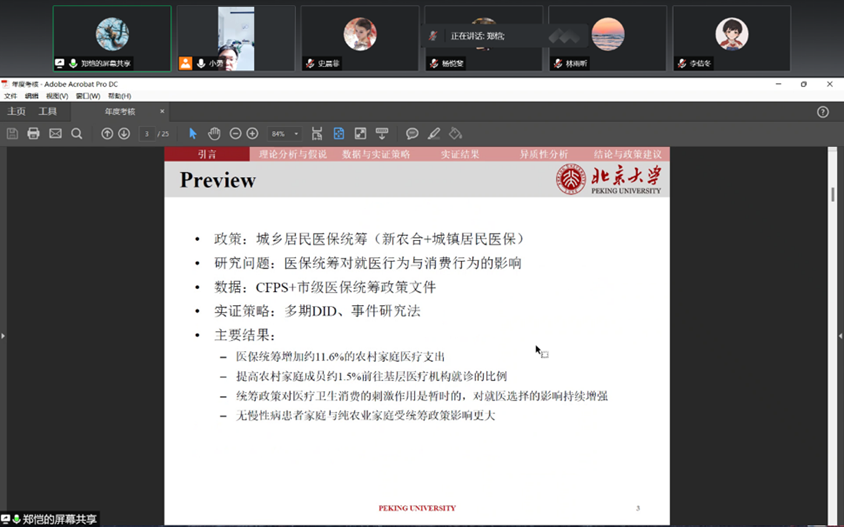 2020级博士生郑恺汇报了论文《城乡居民医保统筹、农村就医行为与消费支出》。城乡居民基本医疗保险统筹是对原新农合覆盖人群在医疗保险权益上的极大提升。利用城乡居民医疗保险统筹这一准实验及其在不同行政区推行的时间差异,文章通过多时点双重差分模型检验了医保覆盖面扩大、报销比例上升对农村家庭就医行为与消费的影响。平均而言,城乡居民医保统筹会增加约11.6%的农村家庭医疗支出、约1.5%的前往基层医疗机构就诊的比例,随着时间的推移,统筹政策对医疗支出的刺激作用有所回落,但对就医选择的影响得到持续性增强。异质性分析结果说明,受城乡居民医疗保险统筹政策影响更大的群体是无慢性病患者家庭与收入较低的纯农业就业家庭。