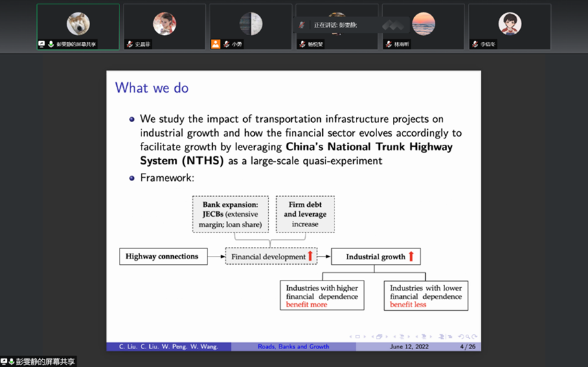 2020级博士生彭雯静汇报了论文《Roads, Banks and Growth: Evidence from a Quasi-Experiment in China》。文章借鉴“国道主干线系统”的自然实验,检验了大规模交通基础设施建设对我国制造业产业发展的影响,并探究了不同融资依赖程度的产业发展异质性,以及与银行部门的互动。研究发现,交通基础设施的提升带来了县域产业增加值的增长,而对外融资依赖程度更高的行业增长更多;可能的渠道是,随着高速公路网的铺设,股份制商业银行更好的捕捉到了发展的机遇,从而进入路网可及的县布置网点,缓解当地企业的融资约束。