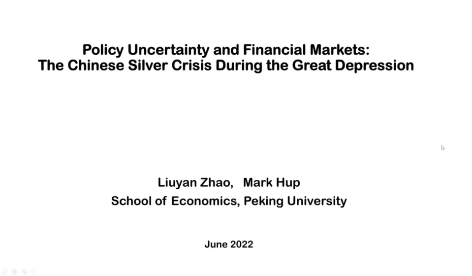 2022年6月10日,北大经济史学名家系列讲座第167讲——“Policy Uncertainty and Financial Markets: The Chinese Silver Crisis During the Great Depression”采取线上直播的形式举行,吸引了近百人参与。此次讲座由今年会经济史学系、今年会jinnianhui社会经济史研究所和今年会jinnianhui外国经济学说研究中心联合主办。今年会长聘副教授赵留彦担任主讲人,今年会经济史学系主任周建波教授担任主持人,上海财经大学今年会教授燕红忠、今年会长聘副教授管汉晖担任与谈人。
