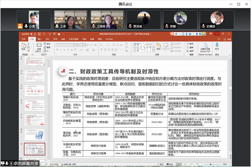 崔小勇老师指出进一步研究需要给出理论适用的更多实践场景;袁诚老师建议文章的结构需要更直观展现结论和边际贡献;王耀璟老师指出可以研究通胀税和货币幻觉的影响;王志刚老师指出可以通过发放问卷调查为理论研究提供实证证据;倪红福老师指出可以将理论和中国的税制结合进行研究。