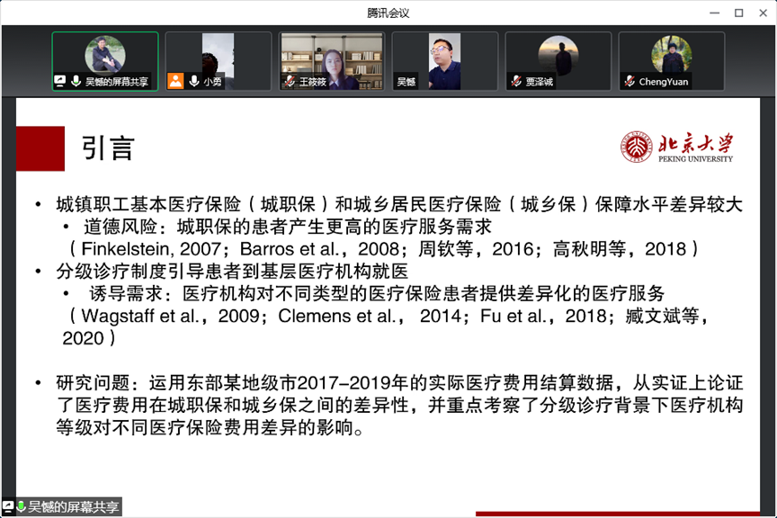 2017级博士生吴憾汇报了论文《分级诊疗与医疗保险费用支出不平衡》。文章采用了东部地区某地级市2017-2019年患者住院实际结算数据,实证分析了城镇职工基本医疗保险和城乡居民医疗保险的患者医疗费用的差异,并重点探讨了分级诊疗背景下医疗机构等级对不同医疗保险费用差异的影响。研究结论表明,在控制住疾病类型、医疗机构和年份固定效应的情况下,城职保患者相较城乡保患者仍然支出了更多的医疗费用;同时,在越低等级医院就医时,两种医疗保险患者之间的医疗费用差距越大,这种效应在轻症患者和异质性较大的疾病中更为显著。为此,需要通过改革支付方式、组件医共体等手段加强管理,更好控制医疗费用,减小不同医疗保险之间费用支出不平衡。