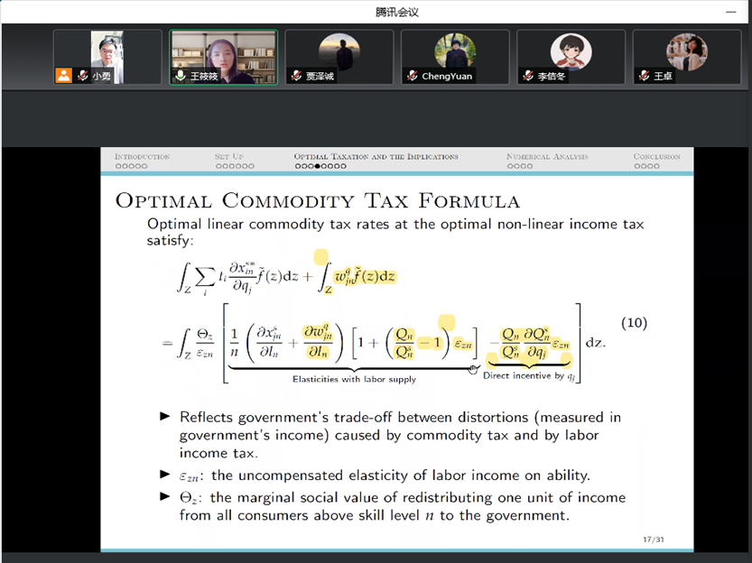 2018级博士生王筱筱汇报了论文《Optimal Mixed Taxation with Misperceptions of Prices》。文章探究了消费者对价格的错误感知如何影响最优混合税制的设计。参照已有文献,理论分析表明,当消费者无法正确感知商品价格和收入税税率时,商品税同时具有矫正作用和再分配作用。即使在Atkinson和Stiglitz(1976)定义的偏好下,仍然有必要在征收非线性收入税时征收商品税。这意味着传统的Atkinson-Stiglitz定理不再成立。当消费者感知的边际收入税税率受到商品税实际税率的影响时,最优收入税的累进程度相对于消费者完全理性的情形将得到提升。数值模拟考虑了对电动车购买实行收入税抵扣的情景,在消费者误解电动车实际价格和收入税边际税率时,对最优的非线性收入税税率和电动车补贴率进行了数值模拟。