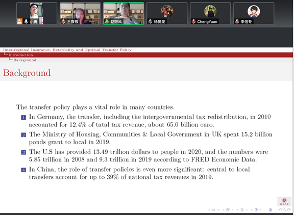 2018级博士生赵煦风汇报了论文《Inter-regional Insurance, Externality and Optimal Transfer Policy》。文章研究了当中央和地方政府之间存在公共支出的外部性和不对称信息时的最佳转移支付政策。通过将扰动法扩展到具有外部性和不对称信息的情形,研究发现,公共支出弹性、公共支出分布、反映区域间公共保险的社会福利权重和外部性共同影响着最优转移政策,并阐明了外部性对地方政府的公共支出、效用、激励相容和中央政府收入的影响。为了更好地理解最优转移支付,基于手动搜集的中国2019年县级财政数据对理论模型进行了数值模拟。研究给出了最优的边际转移政策曲线,并发现当把中国目前的转移支付转变为理论最优的转移支付时,会有显著的福利提升,即现实的人均消费将增加0.25-0.6%。
