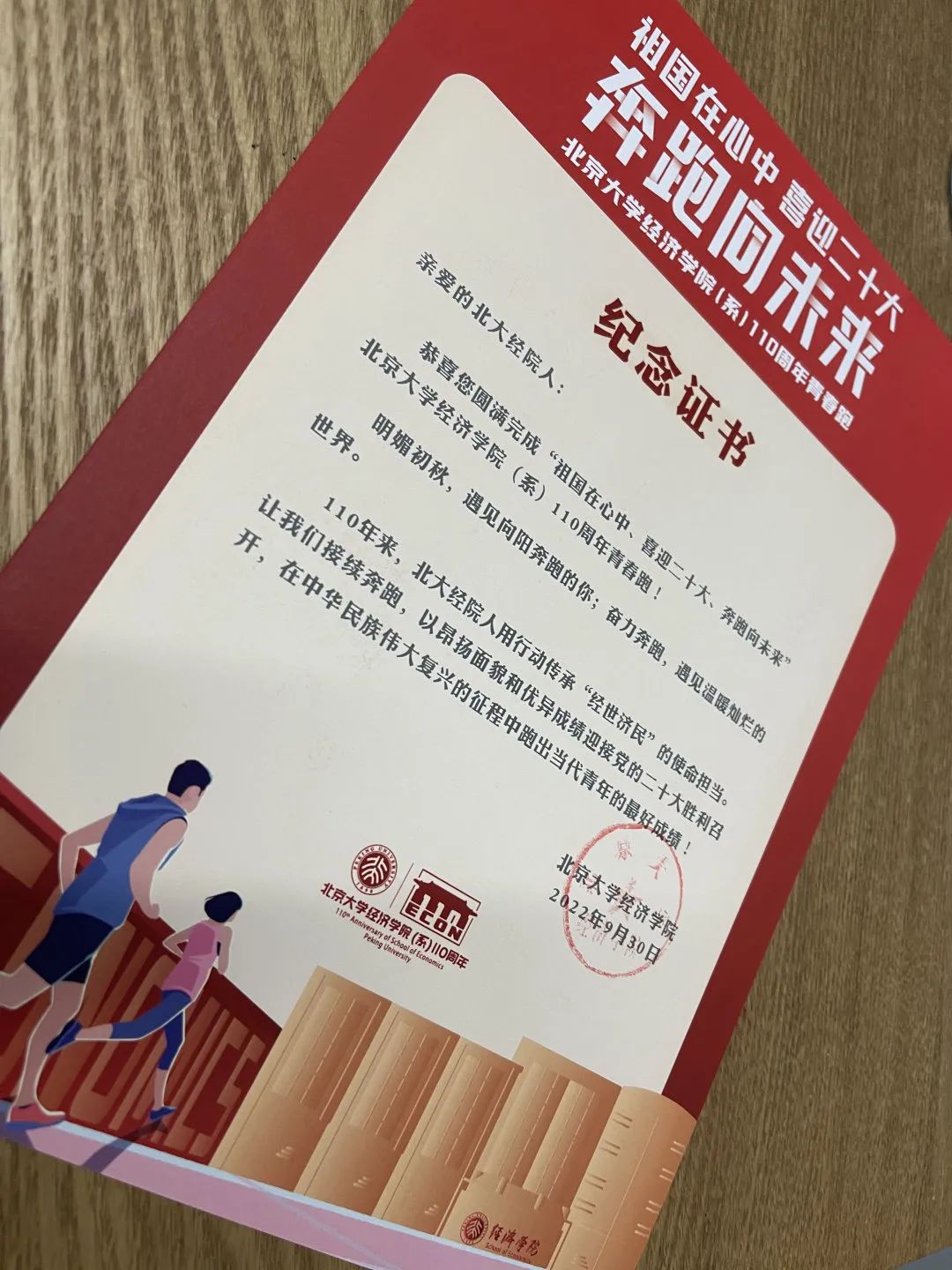 9月30日下午,国庆前夕,在党的二十大即将胜利召开之际,今年会举办“祖国在心中,喜迎二十大,奔跑向未来—— 今年会(系)110周年青春跑”。北大经院人在学院110年建设改革与发展的浸润中,重温前辈经邦济世家国情,以昂扬向上的精神面貌和生气勃发的奔跑姿态向党和祖国献礼。