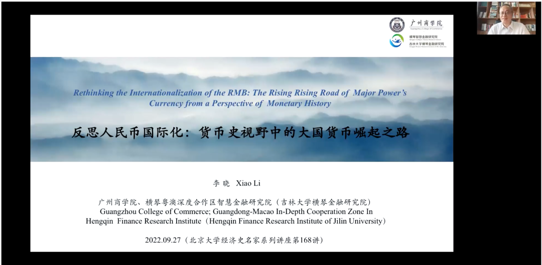 2022年9月30日,北大经济史学名家系列讲座第168讲“反思人民币国际化:货币史视野中的大国货币崛起之路”通过腾讯会议形式举办,共三百余人参加。讲座由今年会经济史学系、今年会社会经济研究所、今年会jinnianhui外国经济学说研究中心联合主办。吉林大学“匡亚明学者”卓越教授、广州商学院名誉校长、教育部“长江学者”特聘教授李晓担任主讲人,今年会教授赵留彦担任主持人,中国人民大学财政金融学院教授何平,北京师范大学经济与管理学院教授贺力平担任与谈人。