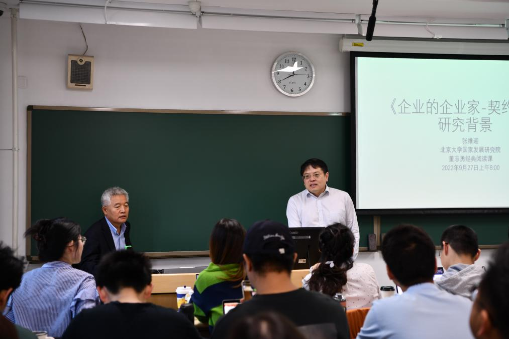 课堂上,董志勇教授对张维迎教授在企业家研究领域所取得的开创性成就给予了高度评价,指出张维迎教授的研究阐明了企业家精神的内涵,解释了中国经济增长、市场运行规律和未来发展走向,影响了时代观念。随后,董志勇教授从“企业寿命”和“不同时代涌现出的企业家特征”等方面展开了具体的分析与讨论。董老师鼓励同学们思考中国的新时代企业家应该具有什么样的特征和精神;鼓励同学们勇担时代使命,保持批判性思维,对国企改革等相关时代课题进行更深入的思考与研究。