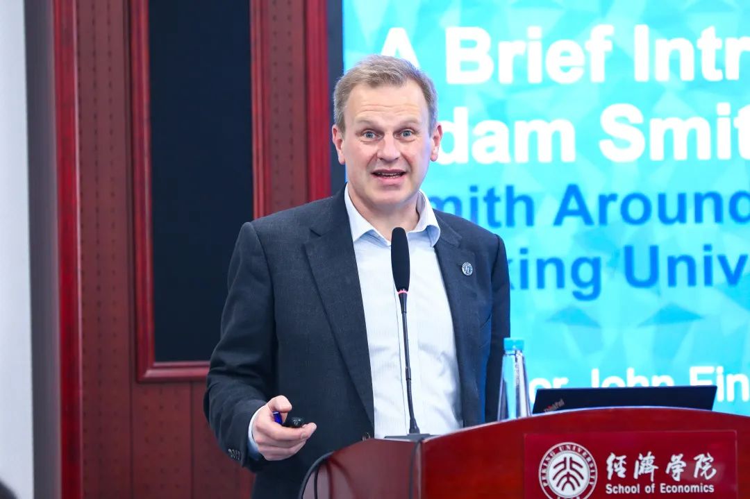 随后,格拉斯哥大学亚当·斯密商学院院长John Finch教授致欢迎辞。他首先对北大经院举办此次研讨会表示感谢,指出本次研讨会是纪念亚当斯密诞辰300周年全球系列庆祝活动的重要组成部分。John Finch教授从创办历史、学科设置和学术水平等方面介绍了亚当斯密商学院的基本概况及亚当·斯密与格拉斯哥大学的渊源,并从亚当·斯密作为学者、教育家和市民三重身份出发,引导经济学家分别对其经济思想、教育理念和社会关怀进行思考。最后,他表达了对格拉斯哥大学亚当·斯密商学院和北大经院开启深入合作的期待。