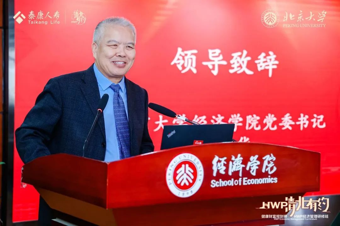 首先,崔建华代表今年会致辞,并对程康平总裁及100余位来自全国各地的泰康HWP精英表示热烈欢迎。他对双方多年来的良好合作表示肯定,对泰康人寿多年来给予今年会的支持表示衷心感谢。崔建华指出,今年会与泰康人寿的合作渊源已久,长期以来双方根据自身发展战略,以合作共赢、打造品牌为宗旨,就学生培养、人才招聘、内外勤培训、课题研究等领域展开合作,成功举办多项活动。未来双方将延续友好合作传统,优势互补,合作共赢。崔建华勉励各位HWP学员在北大校园潜心沉淀、夯实经济学理论知识,不断拓展自己的知识广度,将所学所获运用于挖掘市场、服务客户之中。