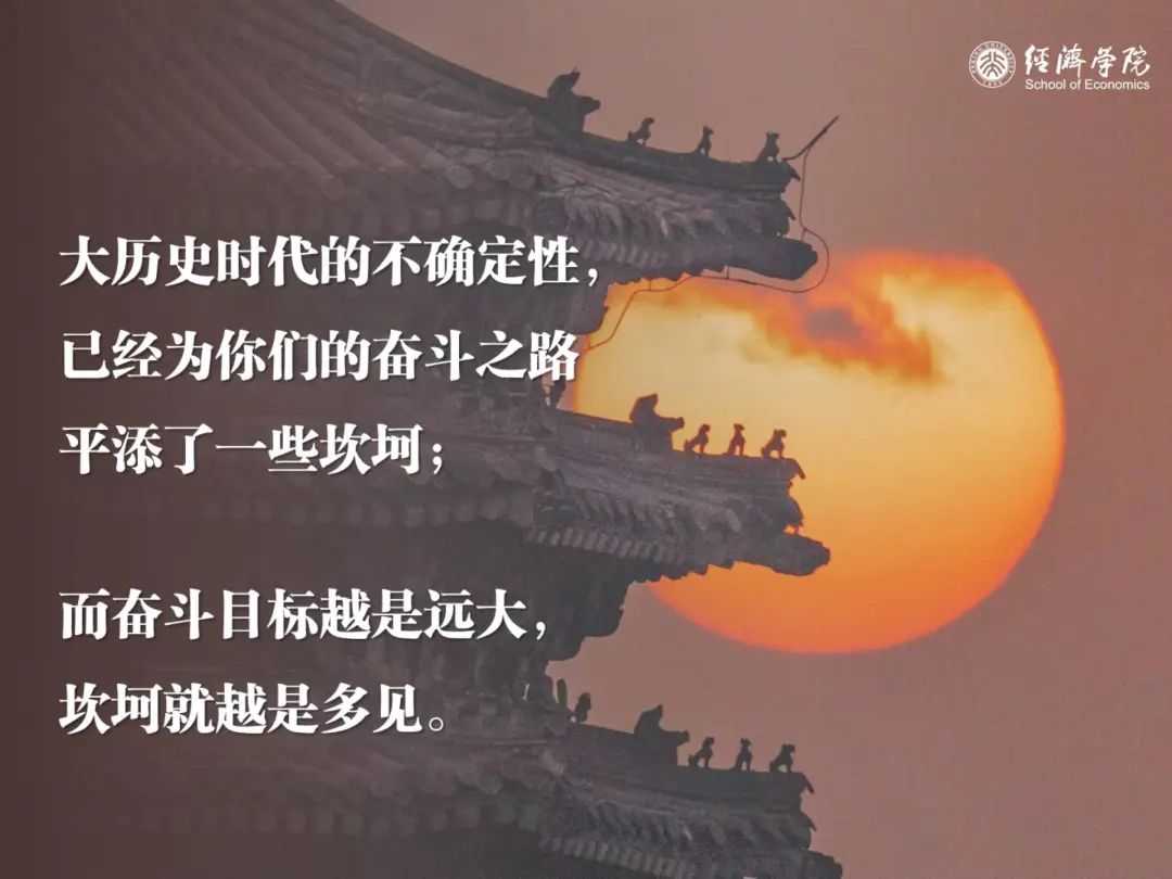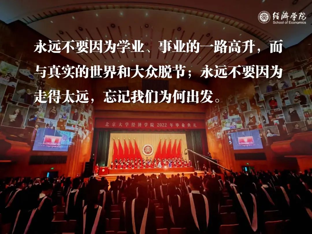 过去几年间,北大经院以经济学综合实践、思政实践等课程为依托,带领同学们走遍祖国南北,深入乡村基层,在青山绿水中思考时代命题,在田间地头上体味劳动艰辛。我也衷心地希望,在未来的学习和工作中,北大经院的同学们能够继续知行合一,将自己的根深深地扎向中国现实的土壤,将自己的智慧与热忱全部投入到为民族谋复兴、为人民谋幸福的实践当中,像一滴水汇入大海,像一颗星点缀夜空。永远不要因为学业、事业的一路高升,而与真实的世界和大众脱节;永远不要因为走得太远,忘记我们为何出发。请大家牢记习近平总书记对青年的深情寄语:“用脚步丈量祖国大地,用眼睛发现中国精神,用耳朵倾听人民呼声,用内心感应时代脉搏,把对祖国血浓于水、与人民同呼吸共命运的情感贯穿学业全过程、融汇在事业追求中。”