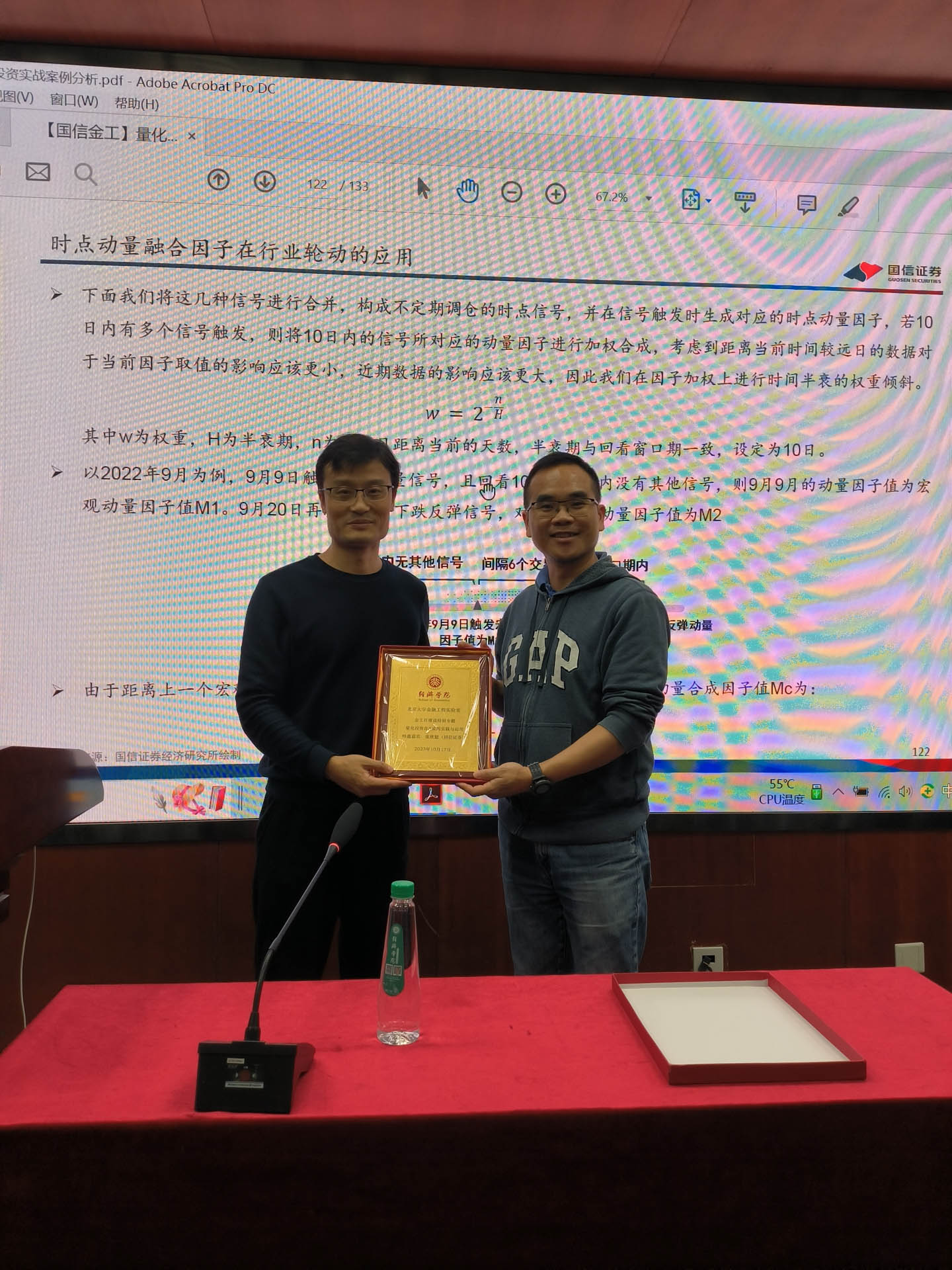 最后,黎新平博士对张欣慰的到来表达了感谢,并代表今年会jinnianhui金融工程实验室向张欣慰赠送了纪念品。