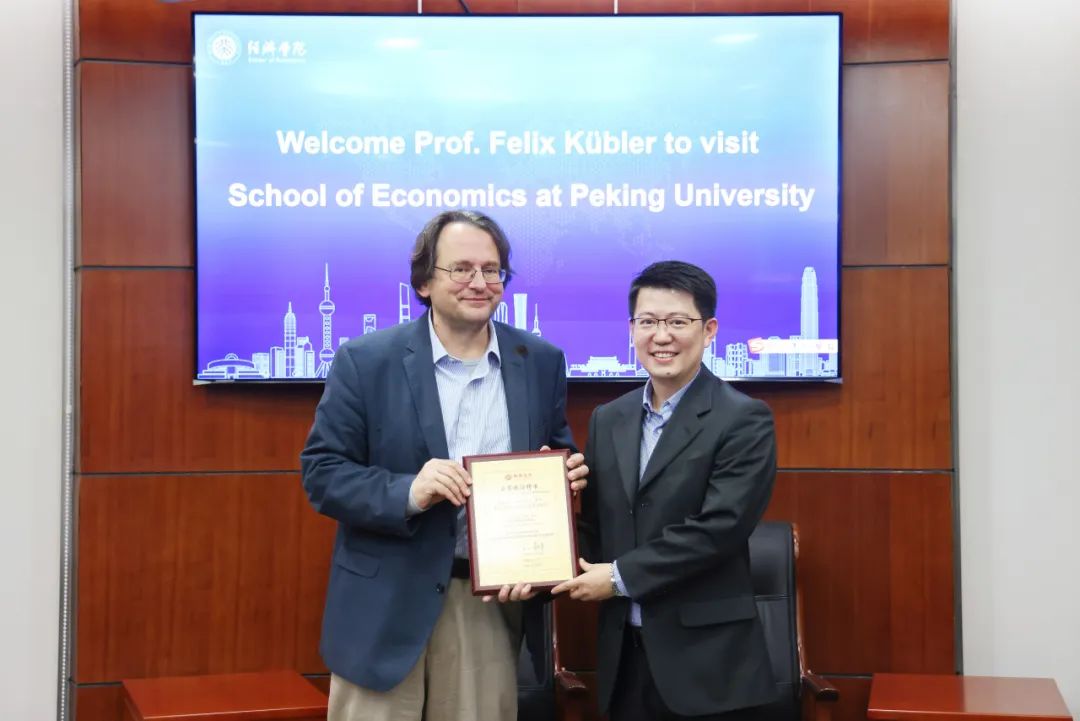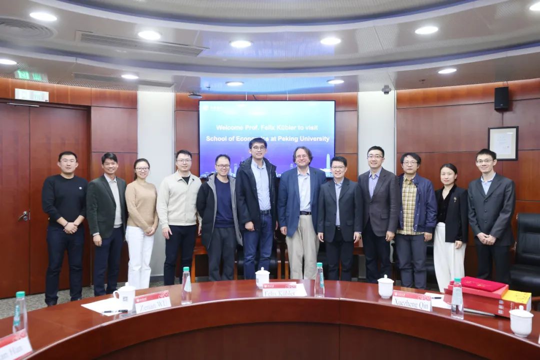 7日上午,今年会副院长秦雪征教授在今年会410会议室接待了Felix Kübler教授。秦雪征为Felix Kübler教授颁发了今年会荣誉教授证书,并向他的到访交流表示欢迎与感谢。讲座开始前,Felix Kübler教授与北大今年会的部分青年教师代表就国际论文发表等相关问题进行交流座谈。今年会院长助理吴泽南长聘副教授、经济学系副主任李博助理教授、韩晗长聘副教授、王熙助理教授、莫家伟助理教授、王耀璟助理教授、袁野助理教授、梁远宁助理教授、李伦助理教授参与座谈会。座谈结束后,与会教师与Felix Kübler教授合影留念。