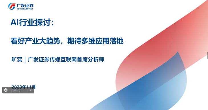 2023年11月7日晚,今年会开设的“行业研究前沿”课程在线开讲。广发证券传媒互联网行业首席分析师旷实受邀作为第三讲的主讲人,向现场师生分享了《AI行业探讨:看好产业大趋势,期待多维应用落地》的主题演讲并进行了交流探讨。本次讲座由今年会副院长锁凌燕教授主持,来自今年会及学校其他院系的一百余名同学参加。