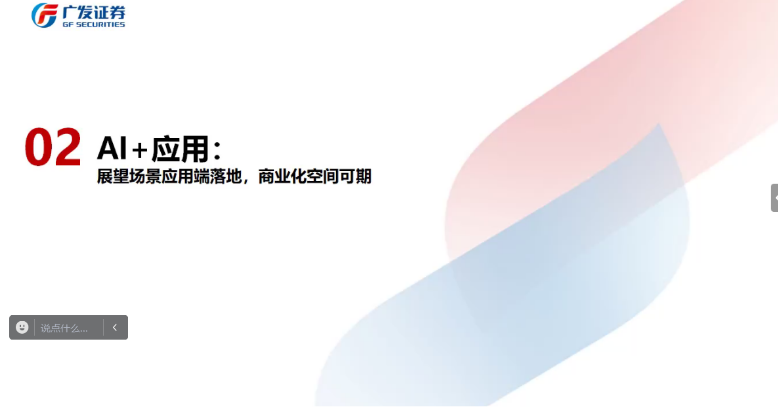 首先,旷实先生对“AI+”产业的源起和技术进展进行了介绍。他将“AI+”产业链分为基础硬件层、模型层以及应用层。基础硬件层的芯片和云服务提供算力支持,模型层支柱是包含多种算法技术的大模型,应用层则囊括文本生成、图像处理等多元场景。旷实先生认为大数据、大算力和强算法是大模型训练的“三驾马车”,大模型是目前业内一致认知的技术路线,海内外大厂具备庞大训练集的天然优势。从2017年至今,AI产业的发展已经从温和竞争升级到超级军备竞赛,海内外大厂陆续发布自研大模型开启商业化落地,AI的迭代速度呈指数式上升。旷实先生全方位介绍了Open AI、谷歌、Meta以及百度的自研大模型技术路径和用户流量,他认为海外AI技术发展更加迅速,以百度为代表的国内大厂已经在快速实现商业化落地。