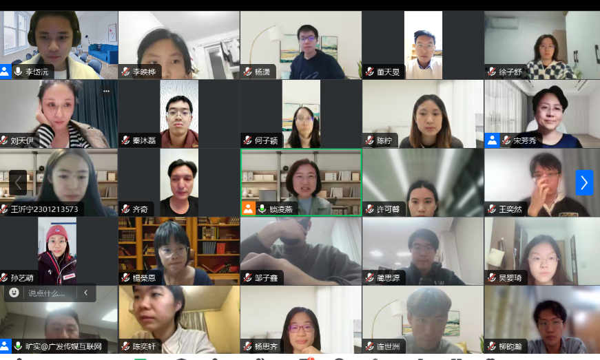 演讲结束后,旷实先生与师生们进行了交流互动。锁凌燕教授对旷实先生的精彩演讲表达了充分的肯定与感谢,她表示,旷实先生深耕互联网传媒领域的行业研究,这次演讲给同学们展示了关于AI在多个产业领域的应用逻辑、底层框架的思考,体现了优秀分析师的理论功底、长期的经验积淀和高频的知识更新能力。同学们踊跃提问,旷实先生一一解答了有关中国在AI产业是否具有相对优势、AI+电商的其他应用场景、AI+XR赛道的发展前景等问题。课程最后,师生们与旷实先生在线上合影留念。