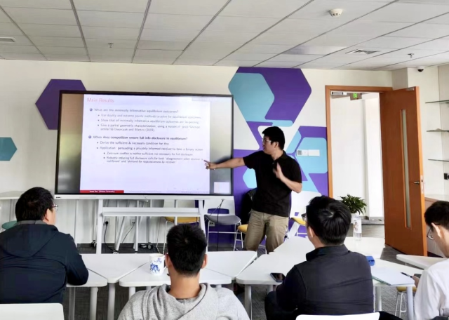 在本次报告中,孙君泽分享了关于线性劝说博弈中竞争的研究。首先,他介绍了相关模型设定,并定义了信息环境,包括发送者的效用函数、接收者的主观先验信念等。基于该模型,孙君泽围绕最小信息均衡、完全披露均衡结果和提升信息传递三个角度展开讨论。基于线性劝说的对偶模型,他推导出最小信息均衡的几何特征,并由此定义了关于信息的价格函数。随后,孙君泽给出完全信息披露作为唯一均衡结果的充分必要条件及信号接收者从发送者竞争中受益的充分条件。最后,他对以上三个问题作总结陈述,并探讨了该结果可能的拓展方向。