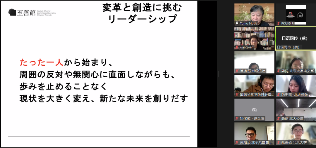 2023年11月10日上午,日本至善馆大学院大学校长野田智义博士作为北大经院“日本名家系列讲座”第十讲主讲人,以“如何培养二十一世纪德才兼备的商业领袖”为题在线发表演讲,并与来自全国各地的近200名听众深入交流。