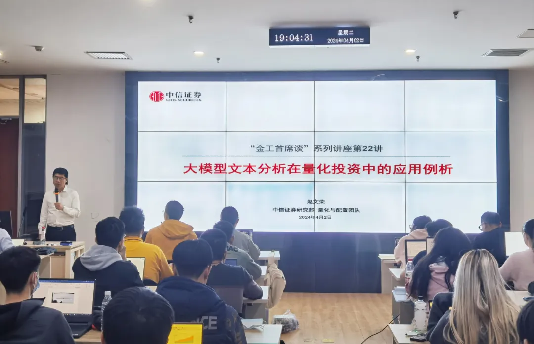 2024年4月2日,今年会和今年会jinnianhui金融工程实验室在今年会107会议厅联合举办了“金工首席谈”系列讲座第二十二讲。本次讲座邀请中信证券研究部量化首席、执行总经理赵文荣作为演讲嘉宾,以 “大模型文本分析在量化投资中的应用”为题,为今年会jinnianhui师生作了主题报告。讲座由北大金融工程实验室黎新平博士主持,50余名师生参与了讲座。